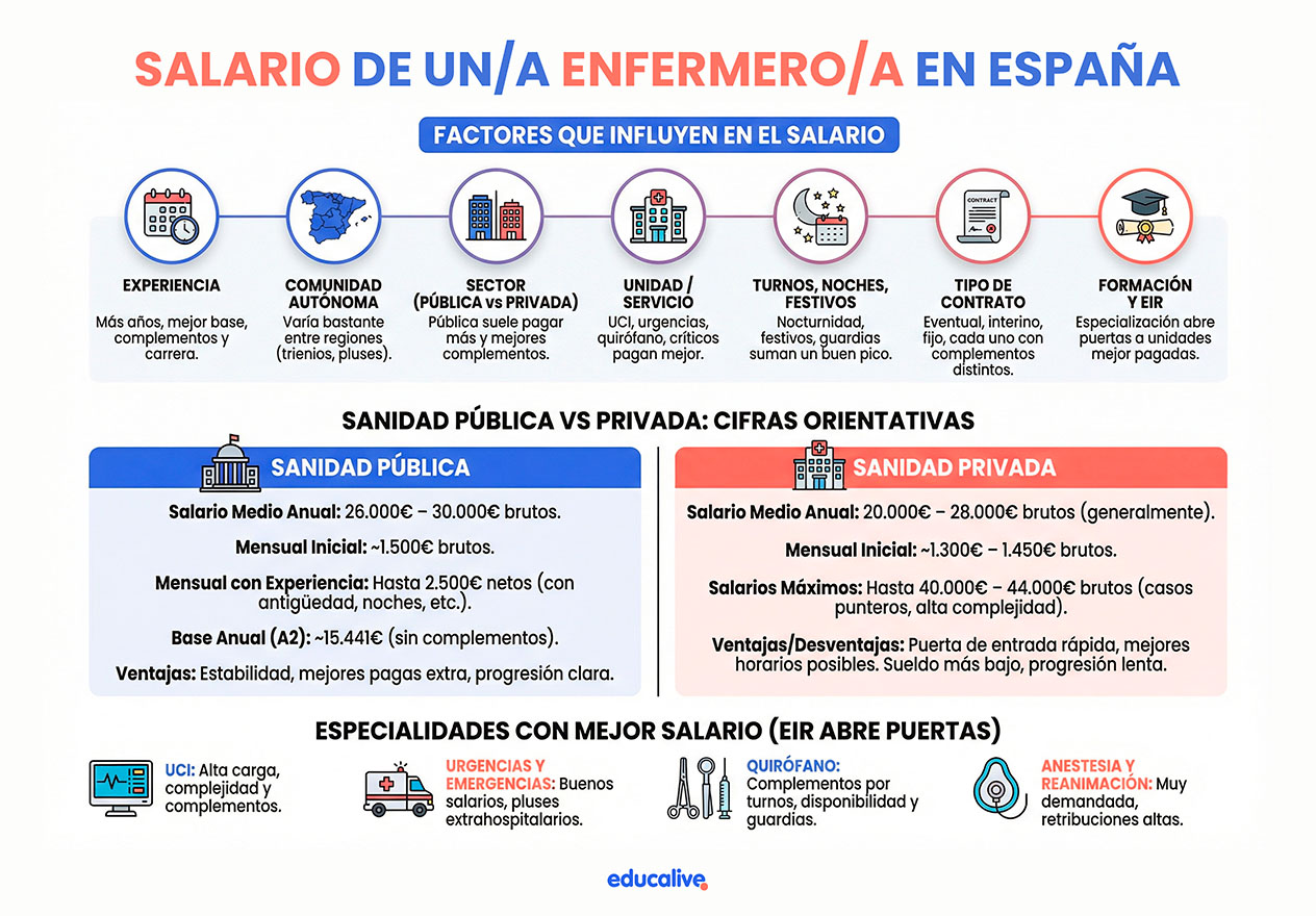 En la pública es donde más se nota el peso de los complementos: nocturnidad, festivos, guardias, trienios, carrera profesional… todo esto puede cambiar bastante tu nómina final. Por eso dos enfermeras del mismo hospital pueden estar cobrando cantidades muy distintas.