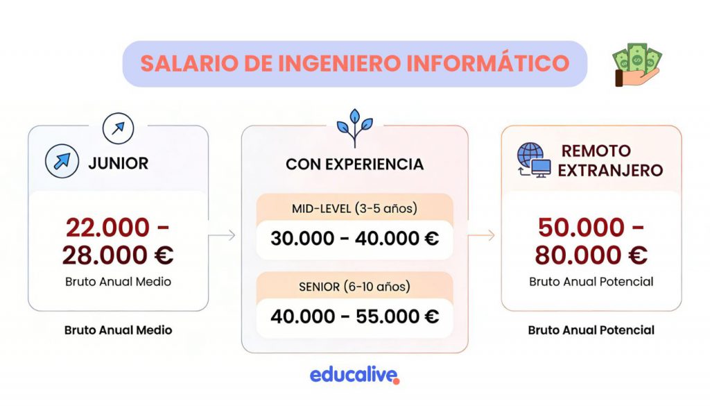 @educalive ¿Quiere saber cuánto cobra un ingeniero informático en 2025? 💸💻 Te dejo unas cifras aproximadamente de lo que puedes llegar a cobrar en puestos de ingeniero informático, siempre orientativos dependiendo de algunos factores como la trayectoria, empresa… #selectividad #cambiarcarrera #estudiarespaña #carrerasuniversitarias #ingeniero #imgenieroinformatico #salario ♬ sonido original – educalive