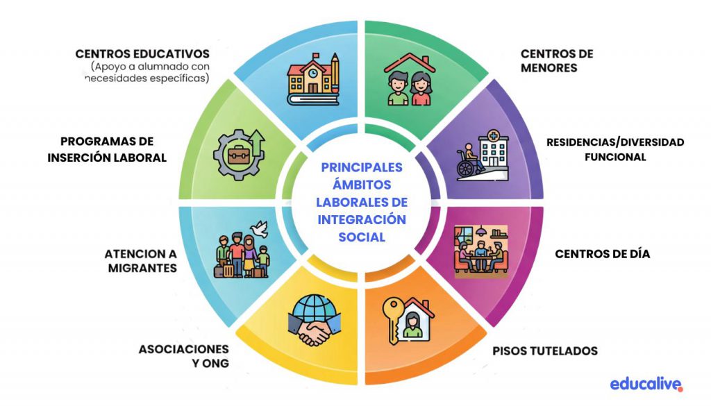 El integrador social no se limita a un único entorno de trabajo. Puede desarrollar su labor tanto en instituciones públicas como en entidades privadas o del tercer sector, siempre con un objetivo común: favorecer la inclusión, la autonomía y la mejora de la calidad de vida de las personas.