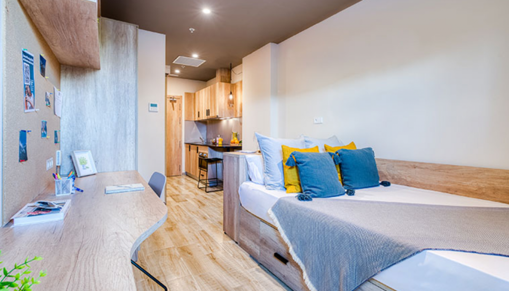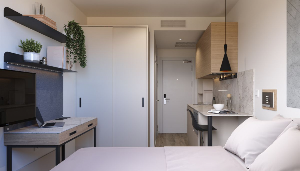 Ofrece estudios individuales totalmente equipados con baño y cocina. Destaca por su comodidad y por permitir una vida muy práctica, sin depender del transporte. Cuenta con gimnasio, salas de estudio y zonas comunes. Es una opción muy equilibrada entre ubicación, servicios y calidad de vida.