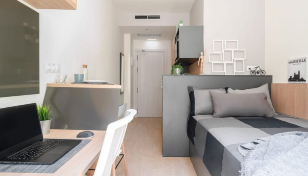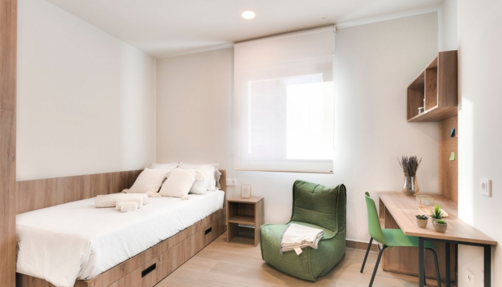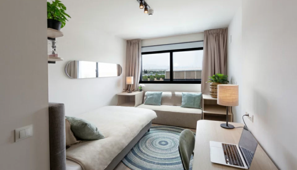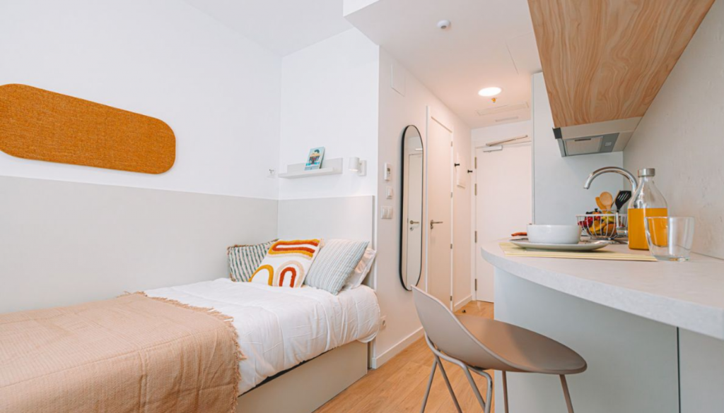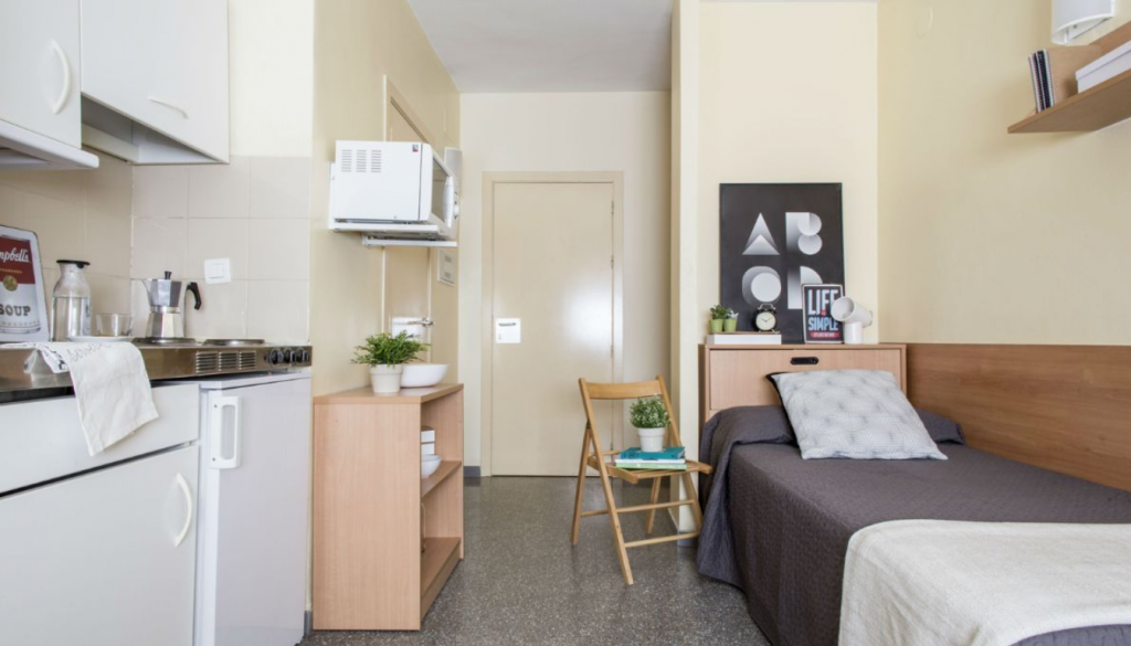 La residencia ofrece principalmente estudios individuales totalmente equipados, con baño privado, cocina propia y zonas pensadas para el estudio. También existen opciones de apartamentos compartidos, ideales si buscas reducir costes o convivir con otros estudiantes.
